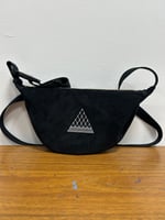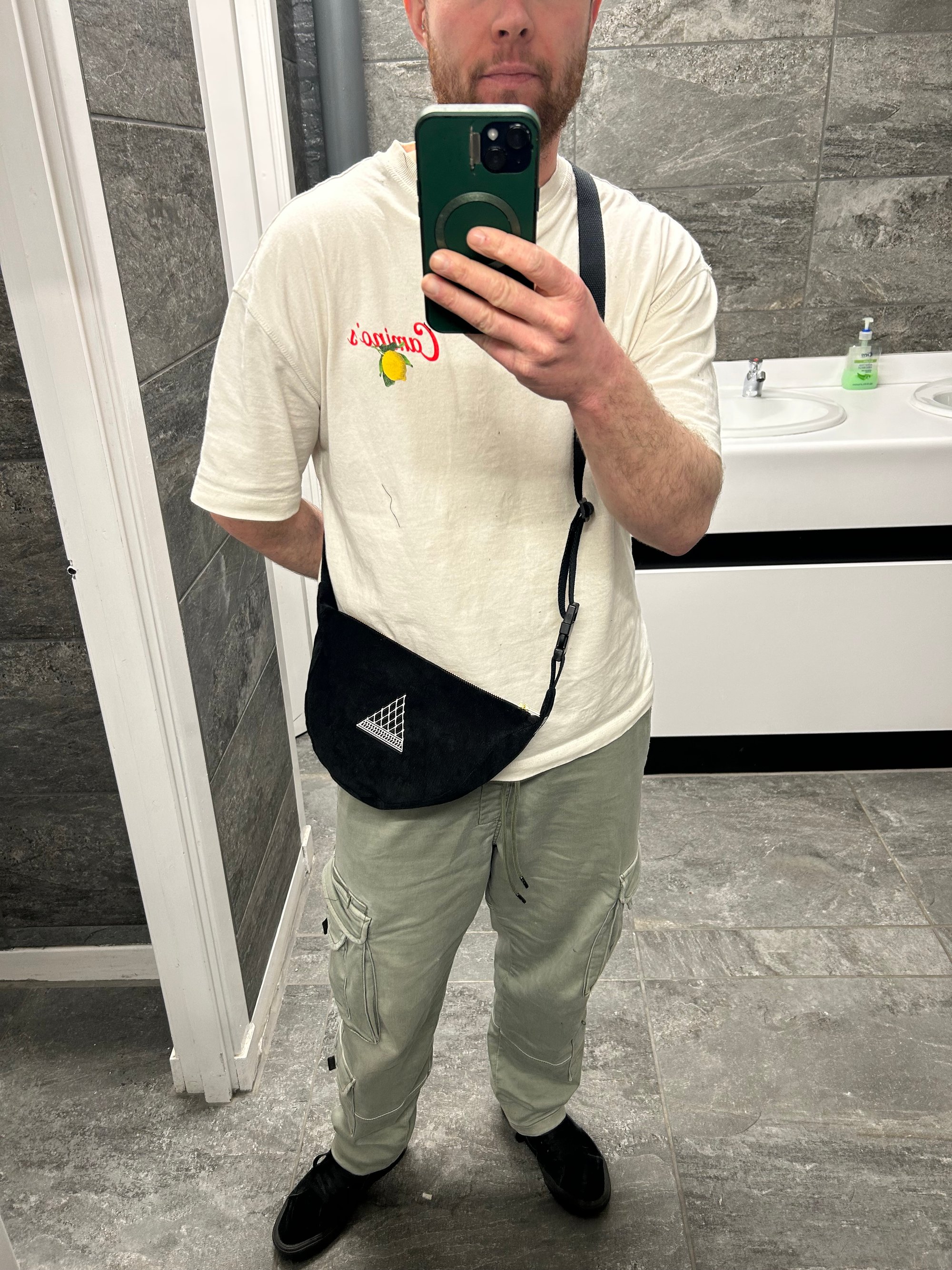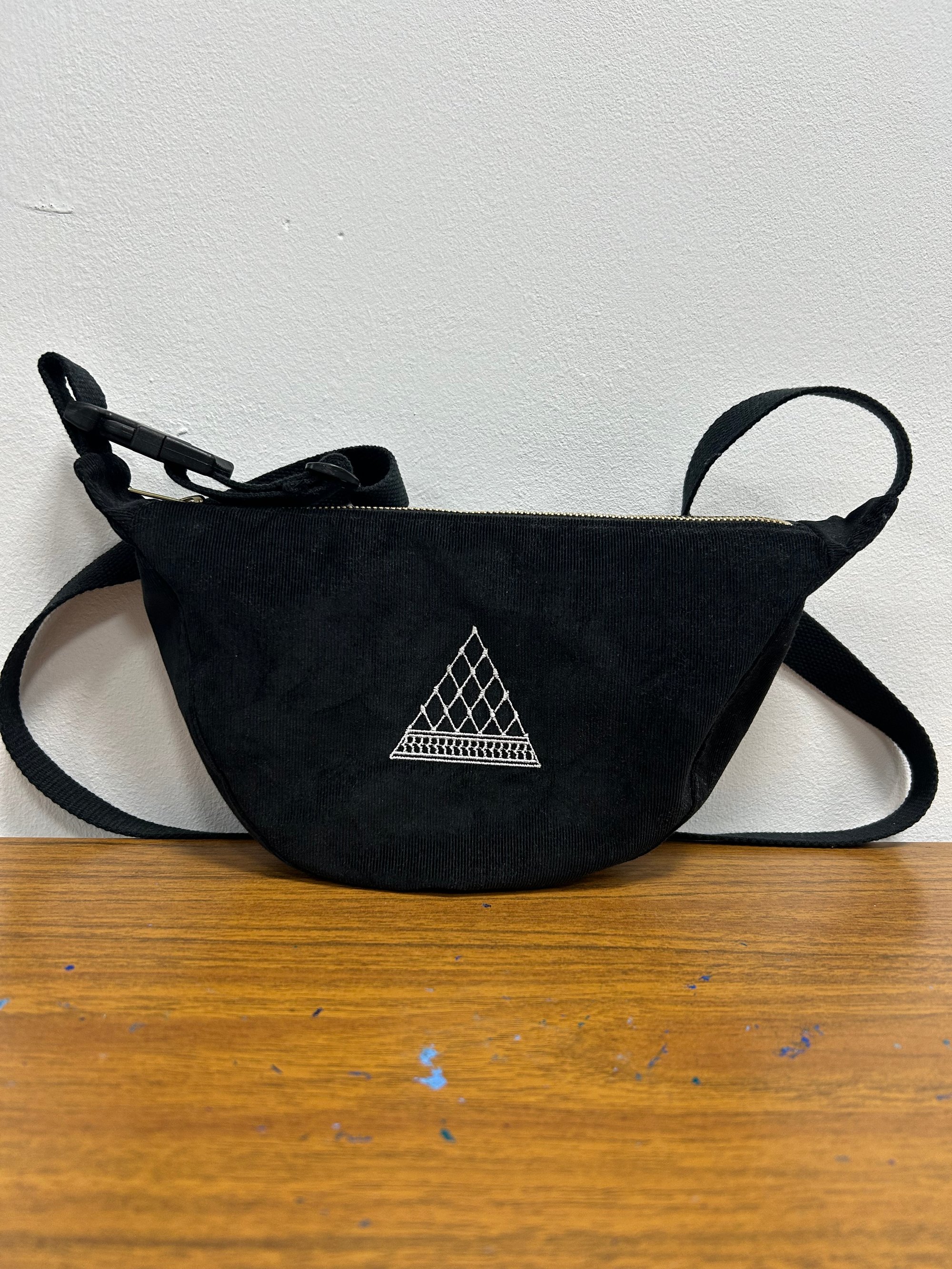 This Keffiyeh inspired mini banana bag is made from a fine black corduroy. It has two small internal pockets and has the option of a carabiner clip for an additional cost. It comes with a buckle strap and is approx 130cm in length.